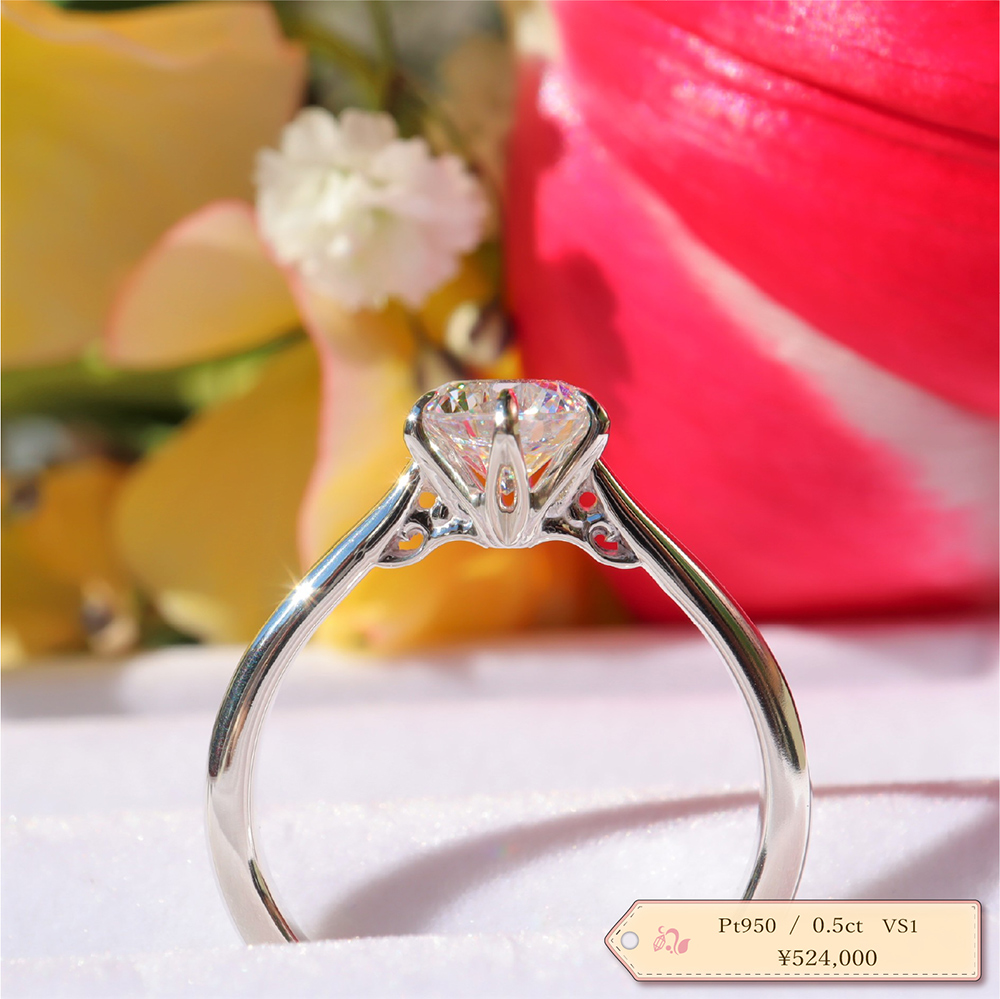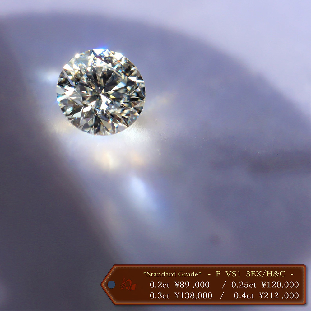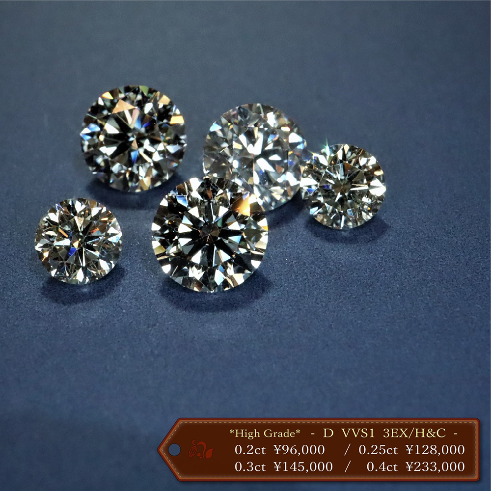 - ブライダル用としてニーズの高い「カラーD~F、クラリティIF~VVS、トリプルエクセレント」のクラスを独自ルートでご用意。