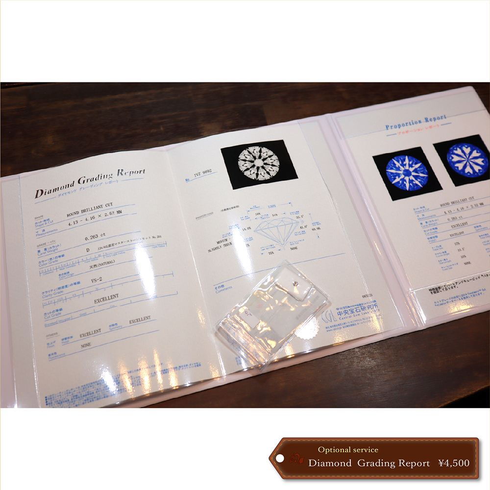 0.2ct以上のダイヤモンドにはすべて簡易鑑定書(ソーティング)が付属しておりますが、ご希望の方にはダイヤモンドの写真付き鑑定書をオプションにてご用意いたします。